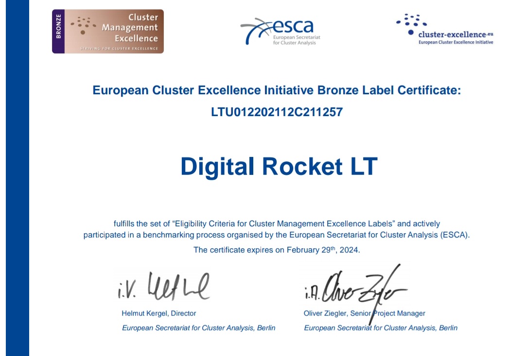 Tech-Park Kaunas ICT cluster "Digital Rocket LT" has received an updated bronze label! It is a certificate of international recognition, which guarantees the quality of services provided. “Cluster Management Excellence Label BRONZE – Striving for Cluster Excellence” indicates the maturity and efficiency of the cluster internationally.